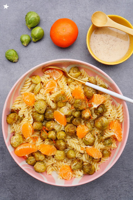 En mode "je fais avec ce que j'ai" avec les jolis produits de notre Amap : les choux de Bruxelles et les délicieuses mandarines, pour un plat de pâte simple, coloré, gourmand (merci la petite sauce crémeuse à la purée d'amande blanche !) et sain.